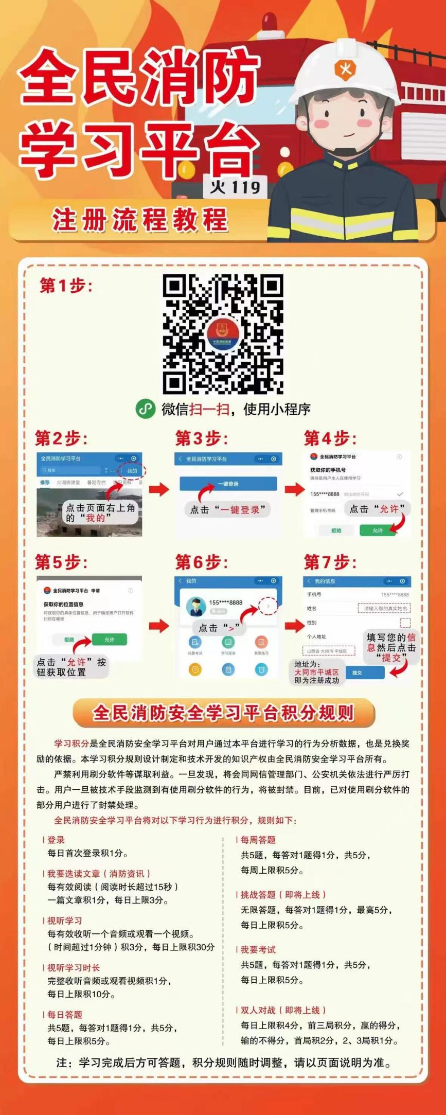 根据平城区消防支队要求,现通知全体学生注册“全民消防学习平台”。注册方法:微信 扫码 注册,地区选择平城区,各学院负责人 安排专人于9 月 23 日下午18时前,将 本次 注册 学生的统计 名单 EXCEL文件 (学院、年级、班级、姓名)以学院为 单位 发送至保卫部邮箱dtdxbwc@163.com 。